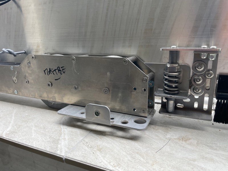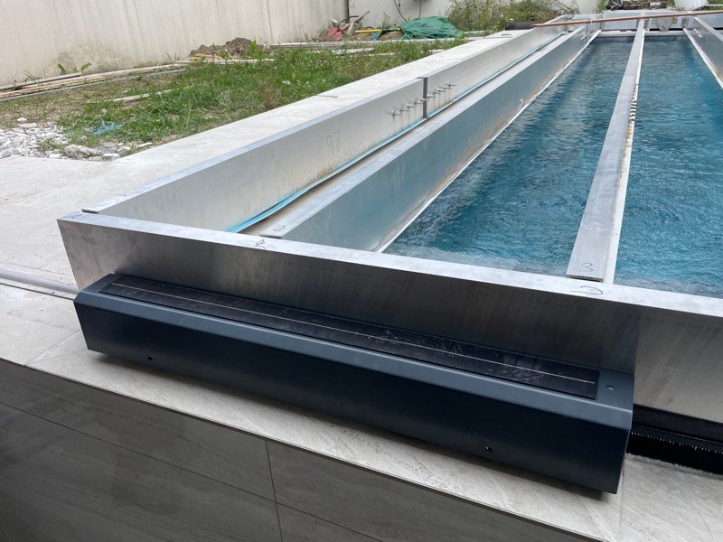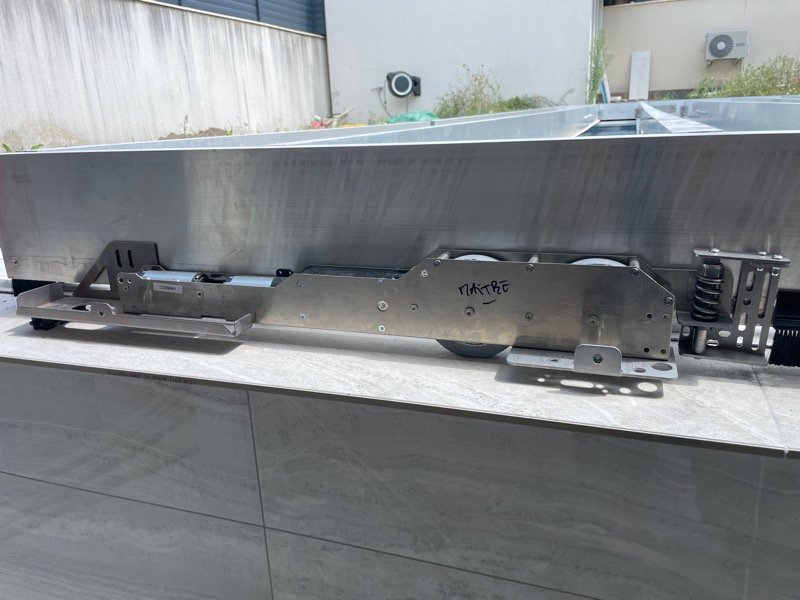 Il s’agit d’un système intégré, conçu et construit en France, qui est également utilisable pour les abris de piscine et autres éléments mobiles. Le système est constitué d’un puissant moteur de faible épaisseur qui entraîne une, ou deux roues en caoutchouc. Ces deux roues sont tressées très fortement sur le sol grâce à un ressort spécial. Ce moteur est alimenté en 12V par une batterie, qui est, elle-même, rechargée par des cellules photovoltaïques placées au-dessus du boîtier.